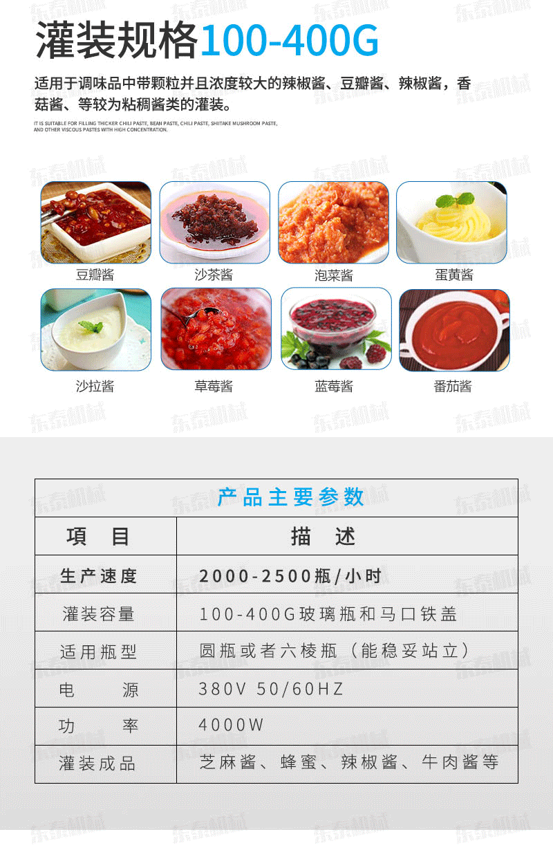 A、番茄醬灌裝機生產線基礎上進行改良設設計,醬料防滴防漏灌裝頭,在灌裝過程中不污染瓶口及瓶身,方便后續的旋蓋和貼標工序。
