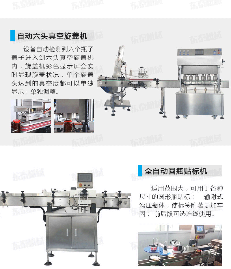 該直線式真空旋蓋機是東泰機械結合用戶使用的情況,摒棄了傳統轉盤式真空旋蓋機的弊端,研制開發的新型設備,設備自動檢測到六個瓶子蓋子進入到六頭真空旋蓋機內,旋蓋機彩色顯示屏會實時顯現旋蓋狀況,整機多點檢測,當進口無瓶無蓋、出口堵塞、定位不準、瓶身傾倒均自動停機。單個旋蓋頭達到的真空度都可以單獨顯示,單獨調整。合格率達到100%!
