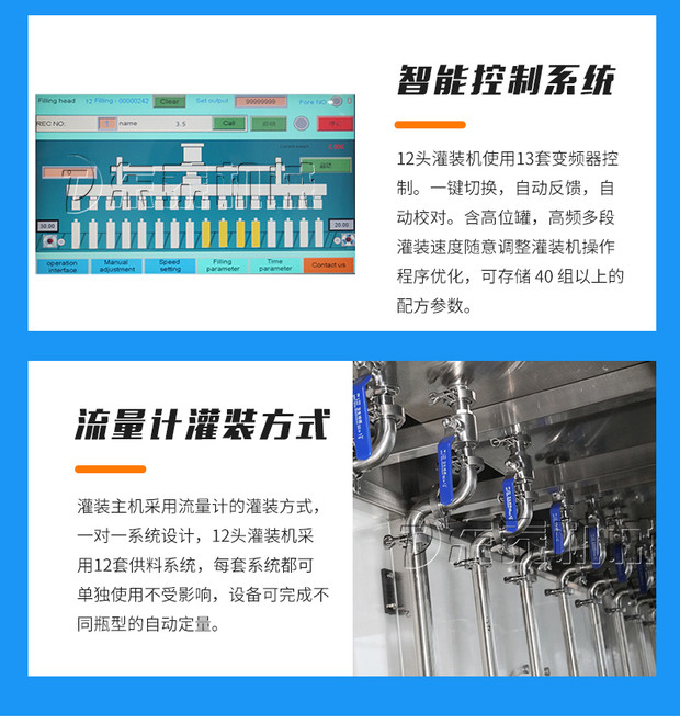 1.智能控制系統(tǒng),12頭灌裝機使用13套變頻器控制。一鍵切換,自動反饋,自動校對。