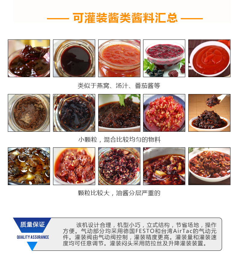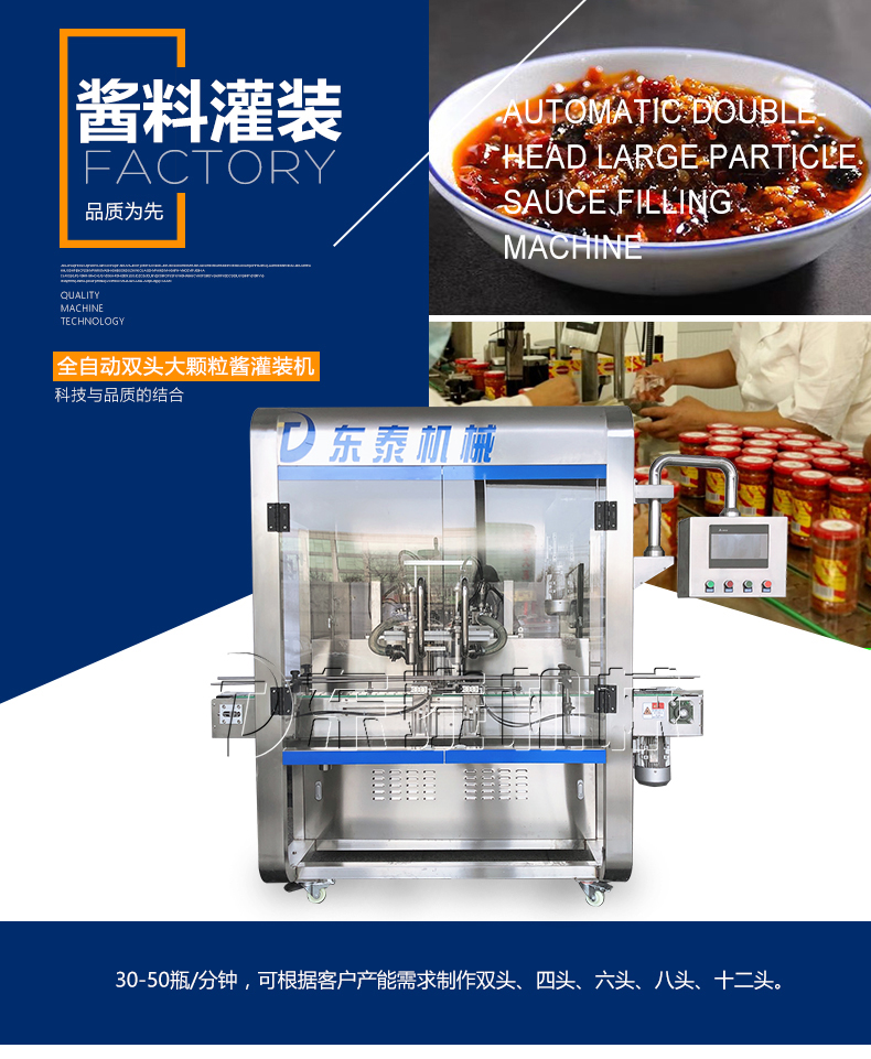 醬料行業(yè)市場(chǎng)日趨龐大,有非常的工作效率,來(lái)滿足客戶需求就顯的十分重要了,我們公司便能給您帶來(lái)這種的幫助,這款辣椒醬灌裝機(jī)灌裝機(jī)身為公司新生產(chǎn)制造的灌裝機(jī)在行業(yè)市場(chǎng)上發(fā)揮了重要的作用,辣椒醬灌裝機(jī)是集光,機(jī),電,氣于一體,選用活塞式定量原理,灌裝精確度高,使用比較簡(jiǎn)單,維護(hù)非常方便,設(shè)備主要材質(zhì):選用SUS3